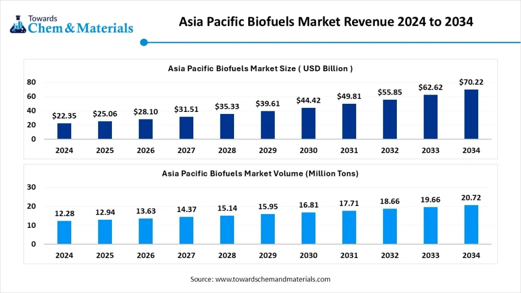 The Asia Pacific biofuels market size was approximately USD 25.06 billion in 2025 and is projected to reach around USD 70.22 billion by 2034, with an estimated compound annual growth rate (CAGR) of about 12.13% between 2025 and 2034.