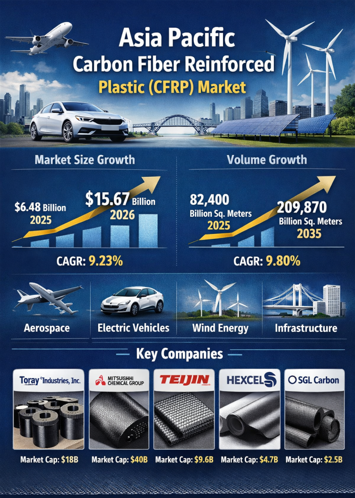 The Asia Pacific region has emerged as the fastest-growing hub for the carbon fiber reinforced plastic (CFRP) market, with significant advancements in aerospace, automotive, wind energy, and infrastructure applications. With increasing demand from the electric vehicle (EV) sector, the aerospace industry, and the renewable energy sector, CFRP plays a crucial role in driving technological progress. This article explores the market overview, dynamics, insights, and key segments that will shape the Asia Pacific CFRP market from 2026 to 2035.