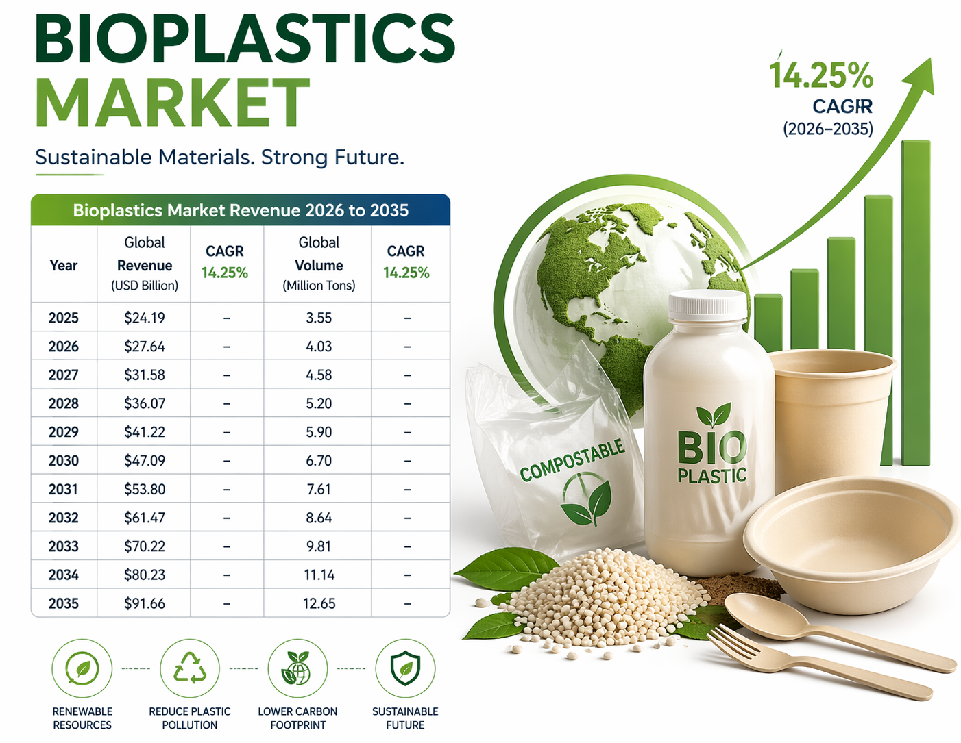 The global bioplastics market is expected to grow significantly, from USD 24.19 billion in 2025 to USD 91.66 billion by 2035, representing a compound annual growth rate (CAGR) of 14.25% from 2026 to 2035. In terms of volume, the market will increase from 3.55 million tons in 2025 to 12.65 million tons by 2035, with a CAGR of 13.55%. This growth is driven by increased demand for sustainable materials in various industries like packaging, automotive, and agriculture.