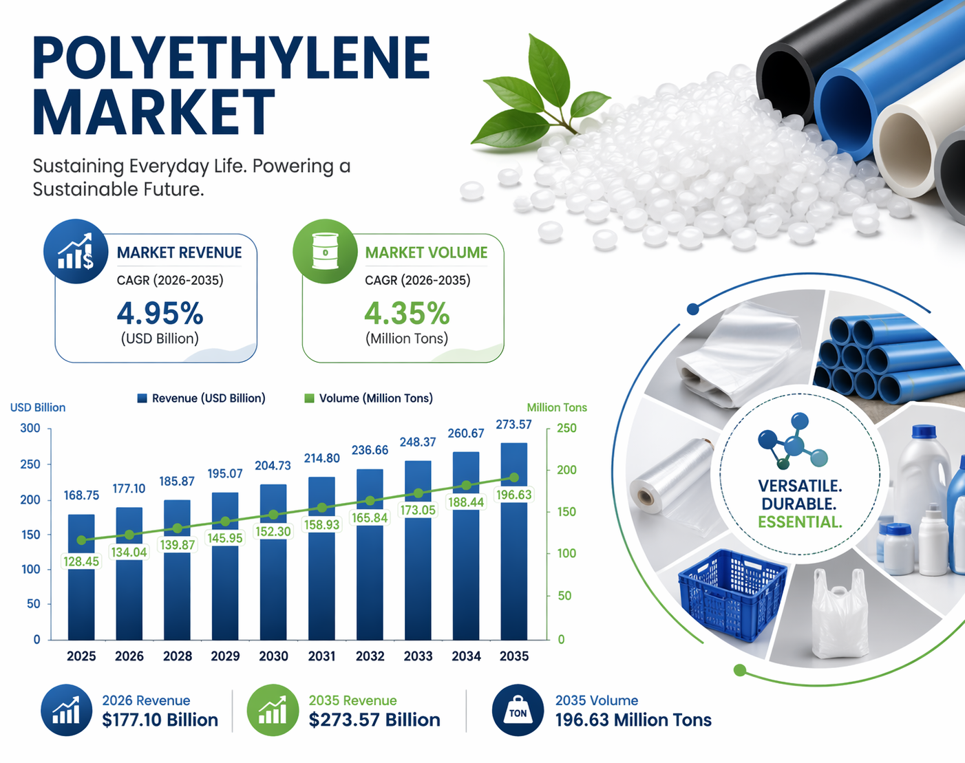 The global polyethylene market was valued at USD 168.75 billion in 2025 and is projected to grow at a CAGR of 4.95% from 2026 to 2035, reaching USD 273.57 billion by 2035. In terms of volume, the market is expected to increase from 128.45 million tons in 2025 to 196.63 million tons by 2035, with a CAGR of 4.35%. This report delves into the market’s growth drivers, trends, key players, and competitive landscape.